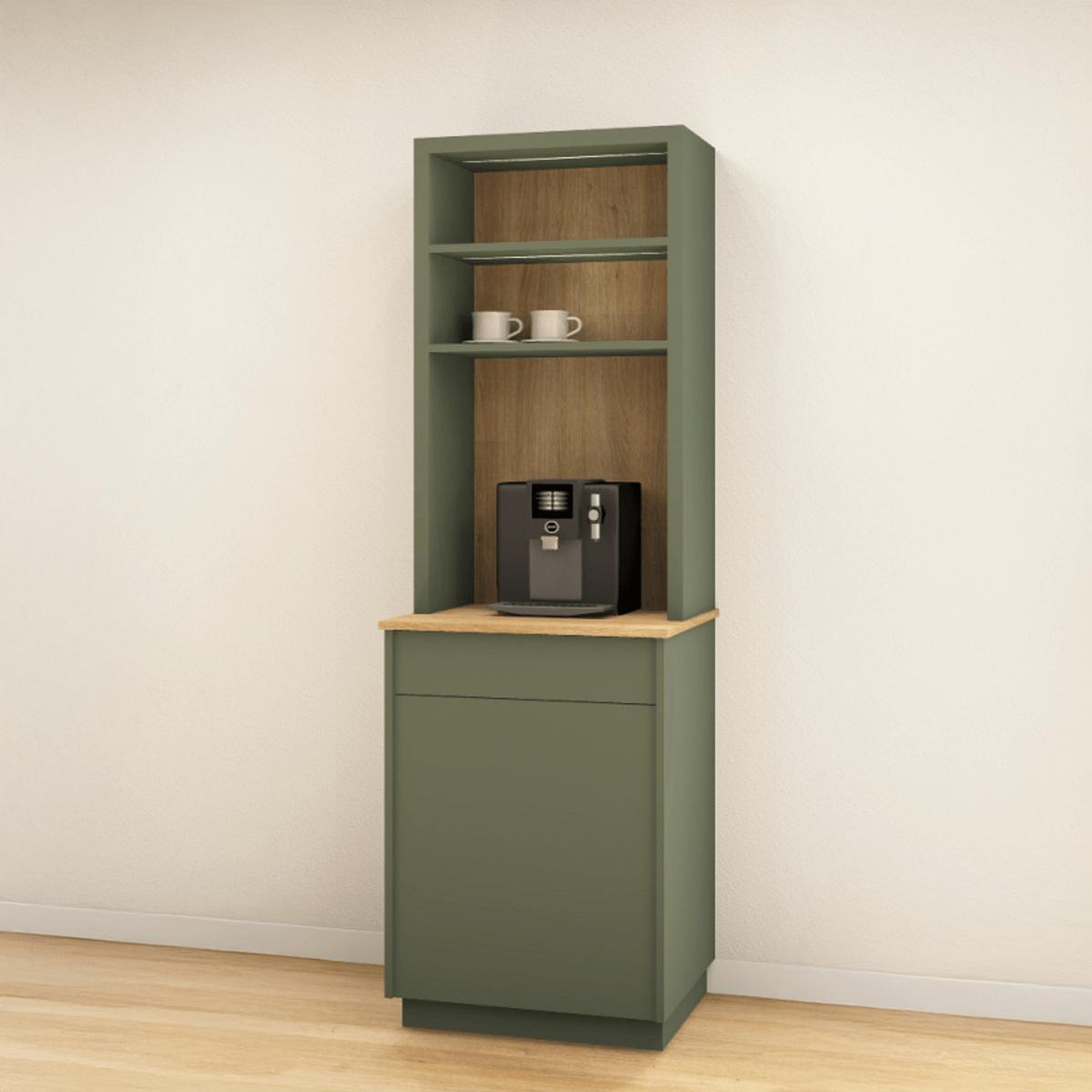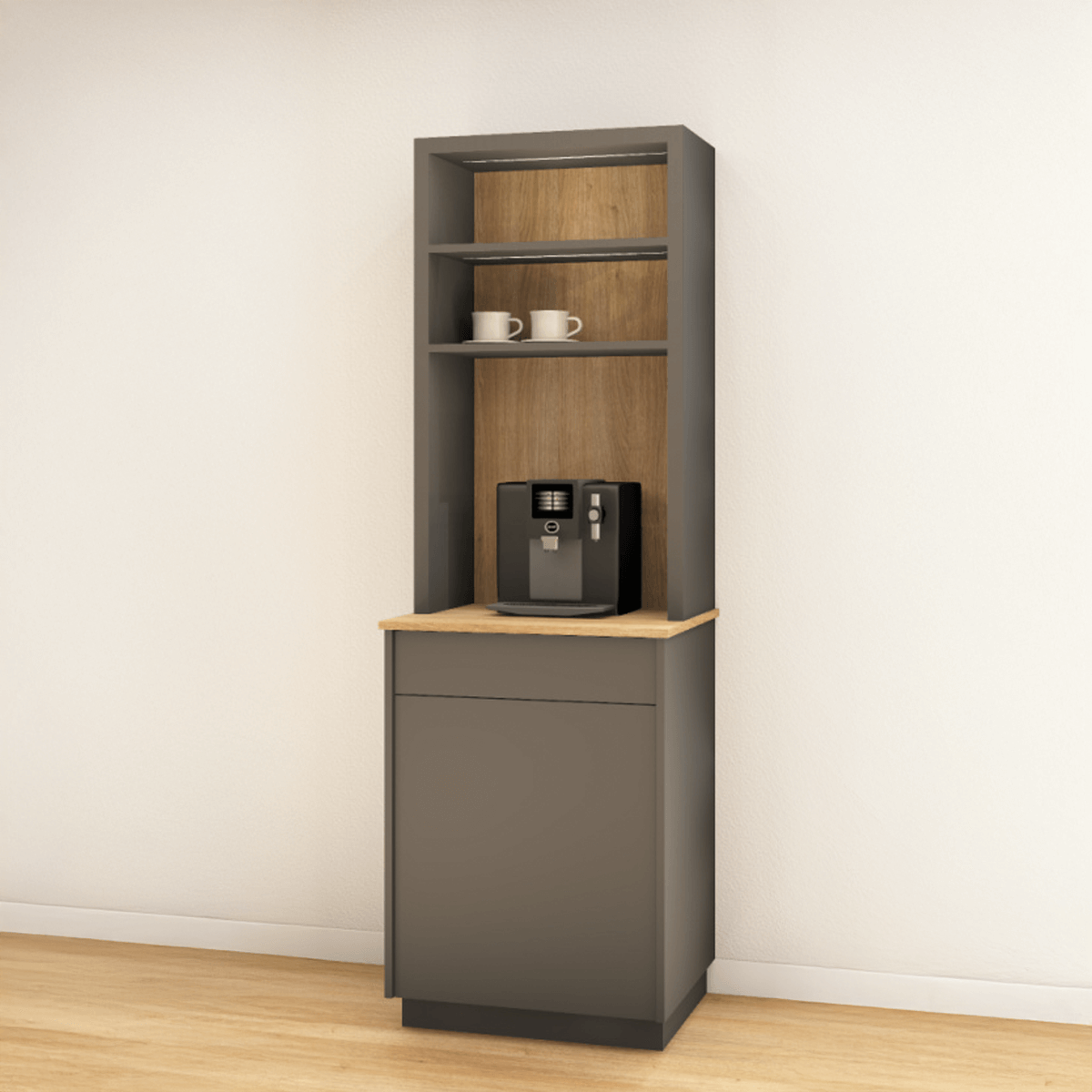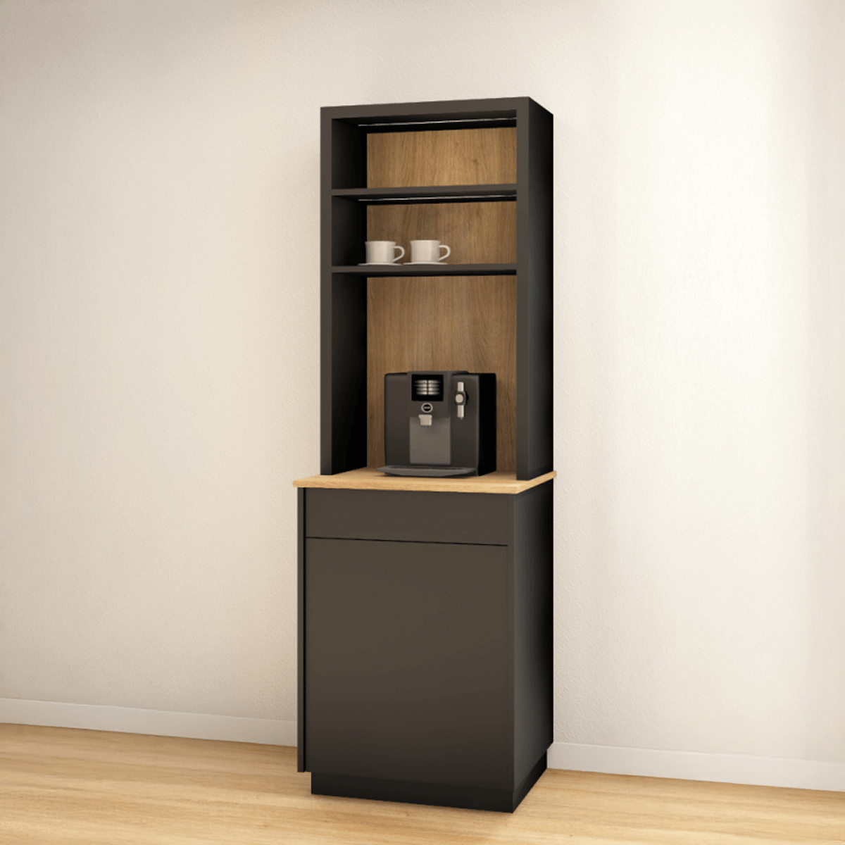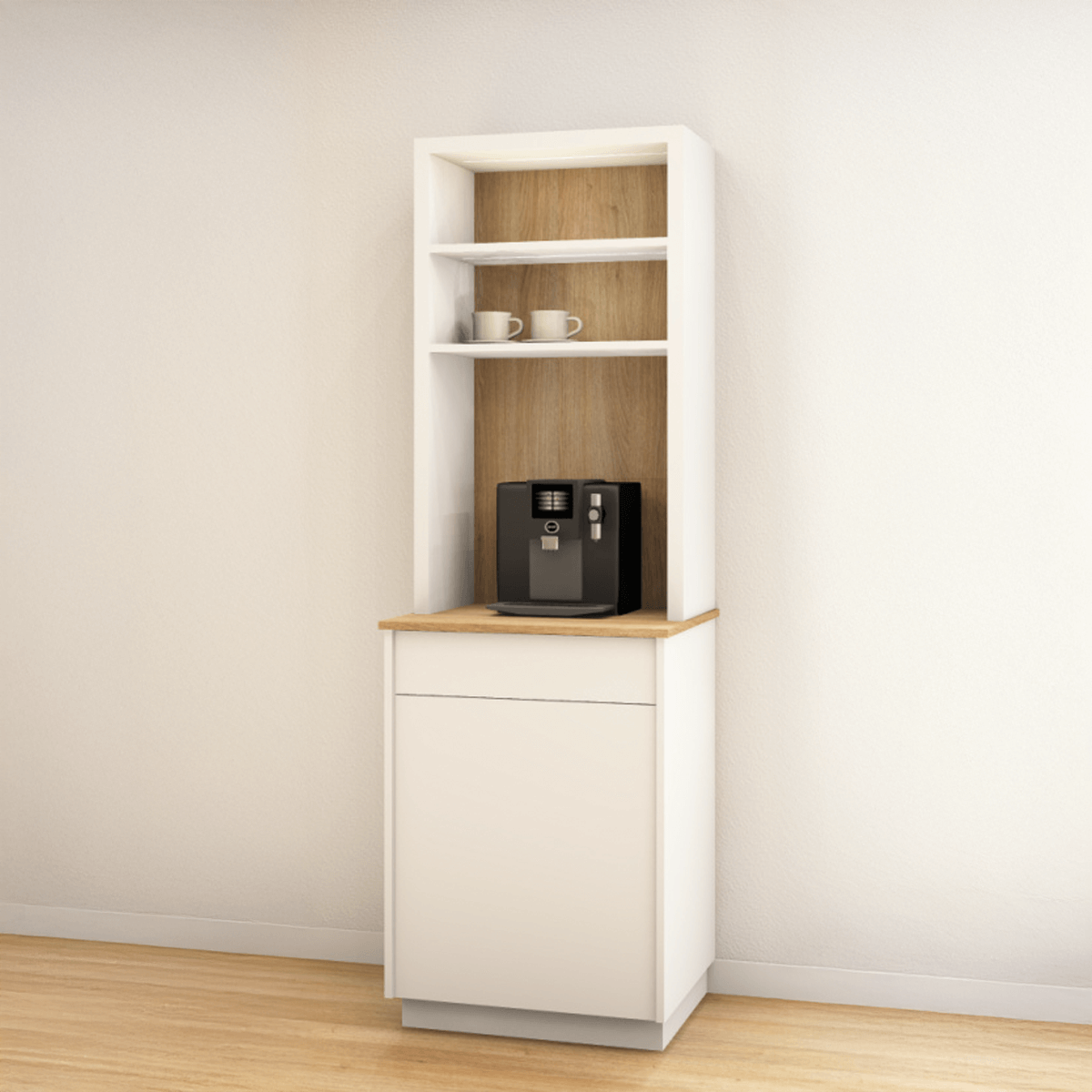 Het meubel beschikt over een uitschuifbare trap met antislip treden, verstelbare schappen en is verkrijgbaar met witte, zwarte of aluminium grepen. Uitvoering mogelijk in wit, antraciet, zwart of eikenlook. Het werkblad en de ombouw zijn gemaakt van 18 mm dik multiplex, afgewerkt met HPL (optioneel).