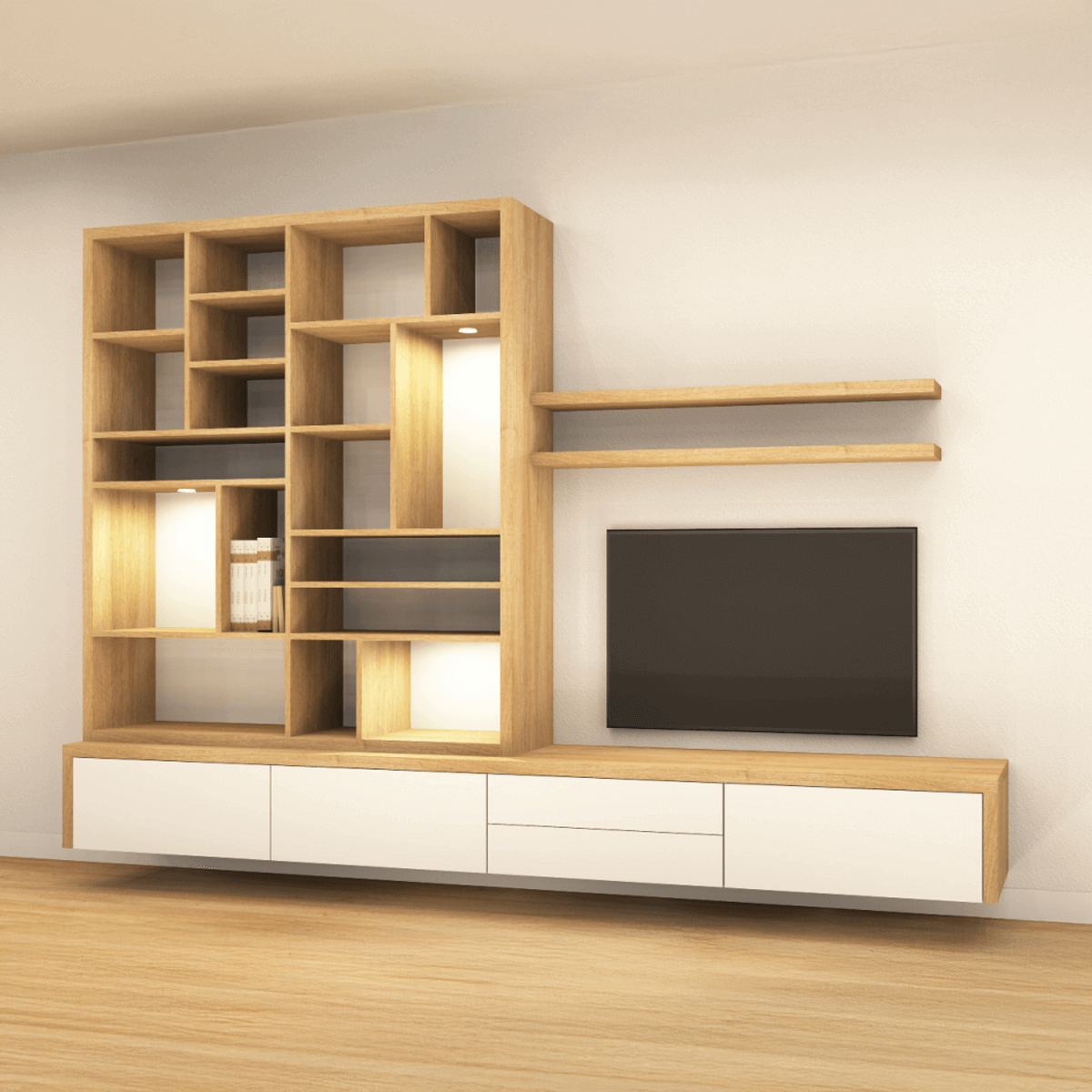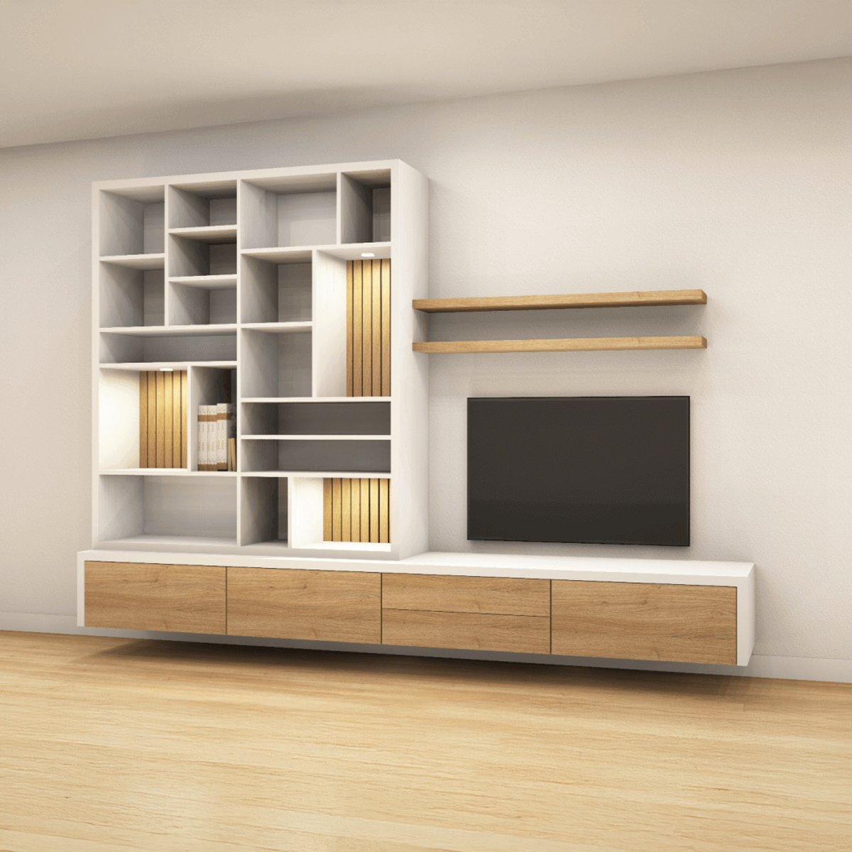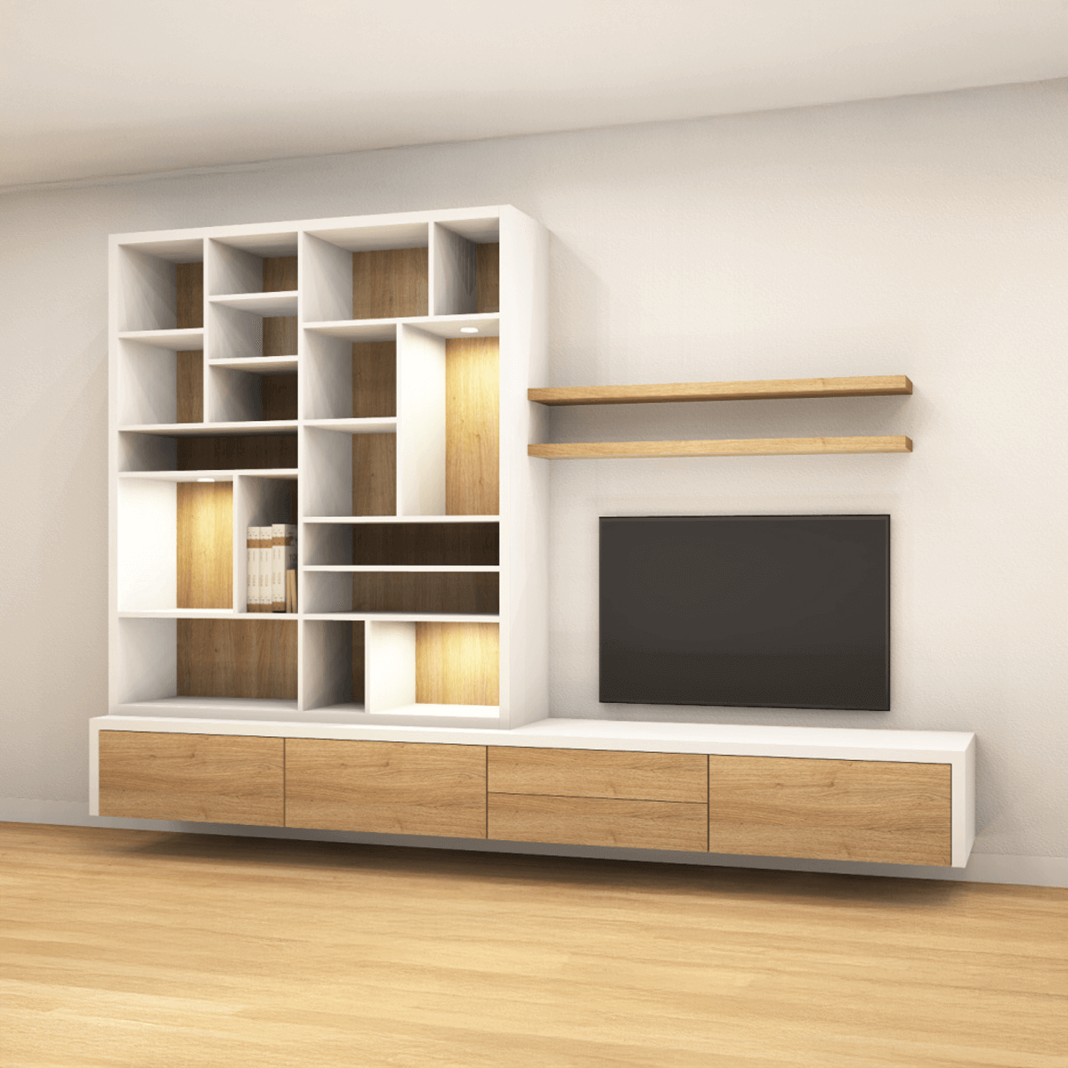 Modern tv-meubel met fronten in wit of eikenlook, ook leverbaar in elke RAL-kleur in zijdeglans. Voorzien van 5 tip-on laden of kleppen en verstelbare schappen. Optioneel met dimbare LED-verlichting.