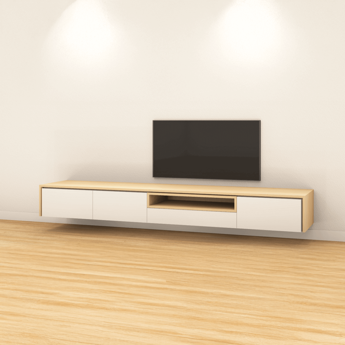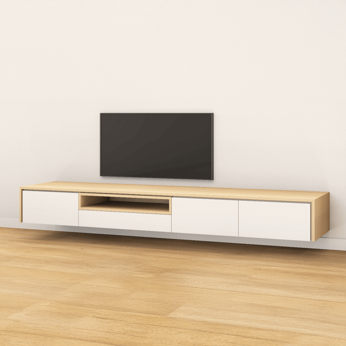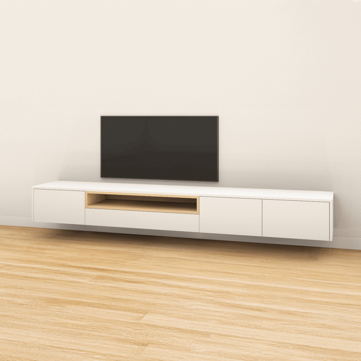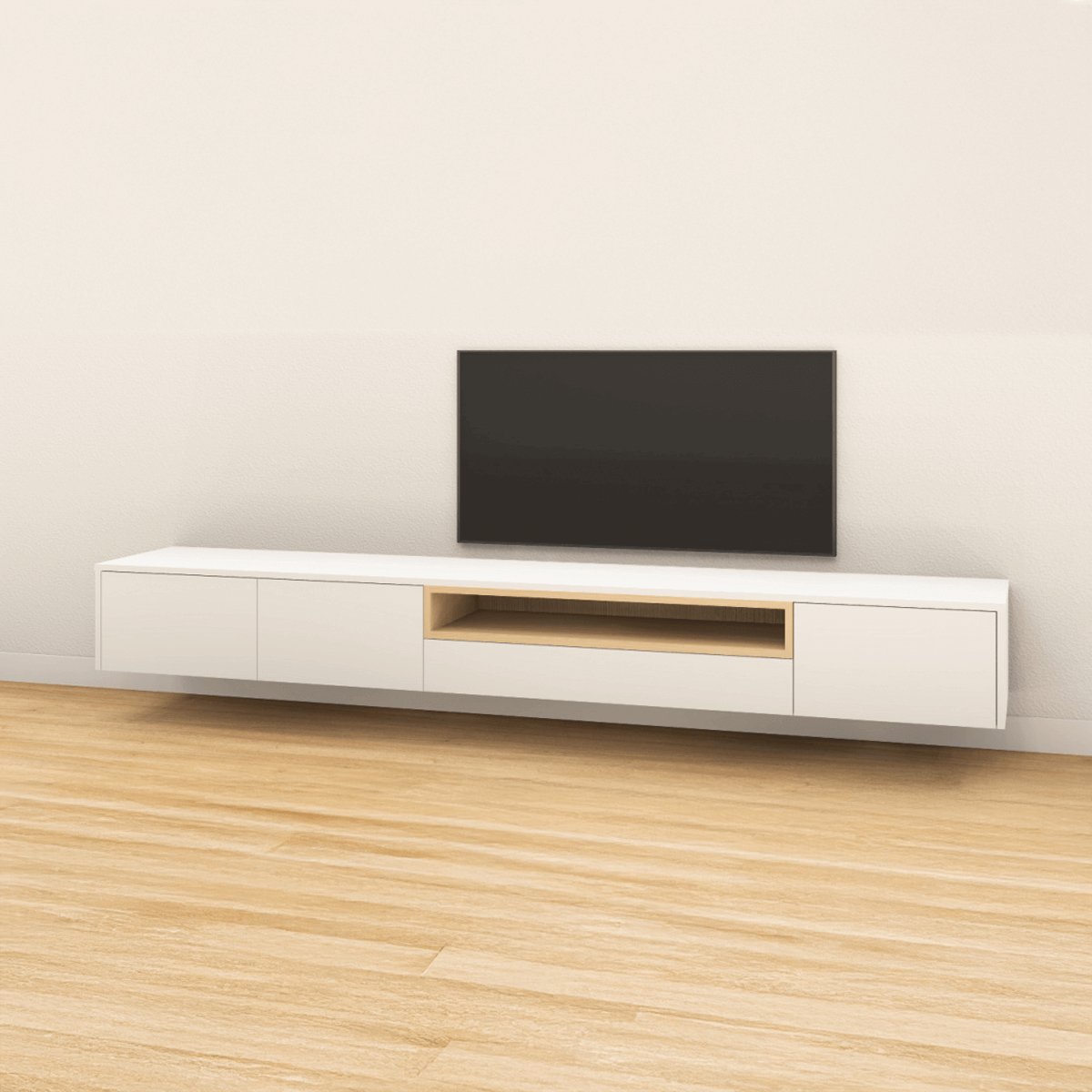 Stijlvol, greeploos tv-meubel met tip-on laden of kleppen. Fronten in diverse kleuren of RAL naar keuze. Zwevend te monteren. Open vak links of rechts. Met of zonder bies